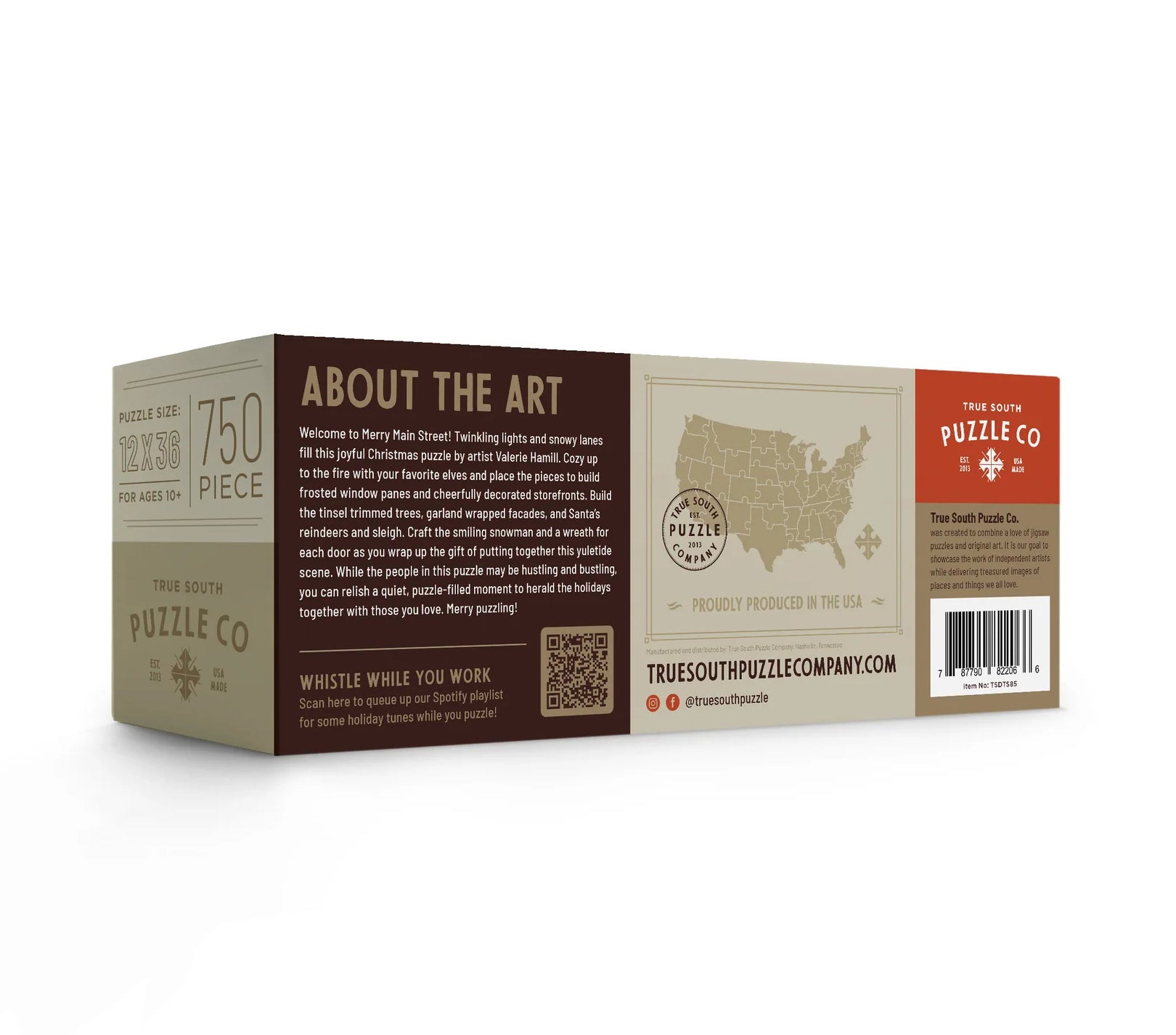 This Merry Main Street puzzle is a panoramic view of a city decorated for the holidays. It features twinkling lights and snowy lanes and is perfect for gift giving! Artist: Valerie Hamill. 750 pieces; 12 inches x 36 inches.